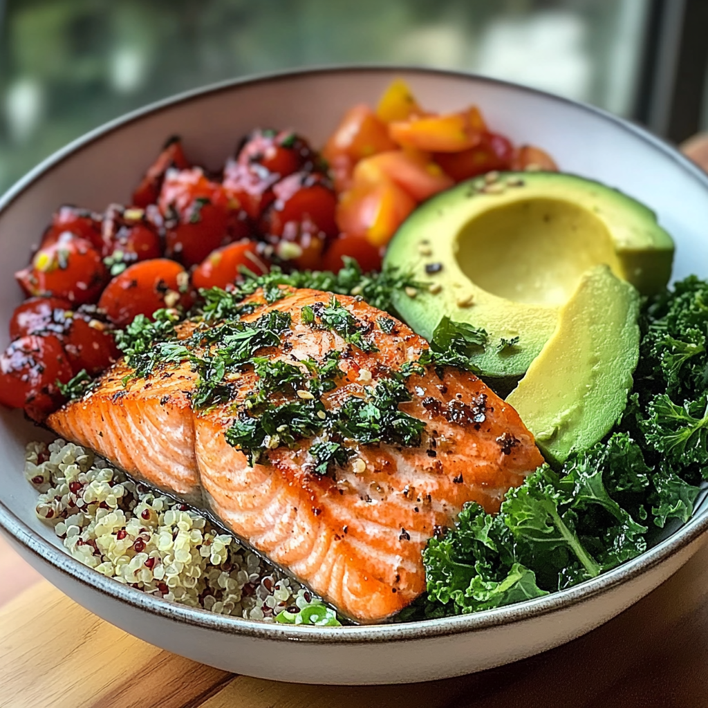 Experience a burst of flavors and textures in this Herb-Roasted Salmon Bowl, featuring succulent salmon, protein-packed quinoa, and vibrant kale, all topped with creamy avocado. Ideal for weeknight dinners or special occasions, this nourishing dish is both satisfying and visually stunning, making it a perfect choice for health enthusiasts and food lovers alike.