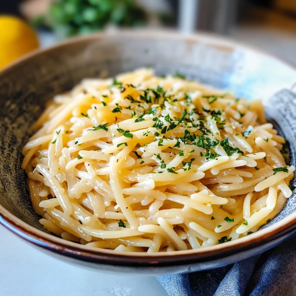 Your Simple Lemon Orzo Pasta deserves an equally appealing presentation! Consider serving it in shallow bowls topped with additional freshly grated Parmesan cheese and a sprinkle of black pepper for contrast. You could also garnish with lemon slices or zest for an elegant touch. For a rustic feel, serve alongside crusty bread drizzled with olive oil and balsamic vinegar. Plating on wooden boards adds an earthy element that complements the freshness of your dish beautifully!