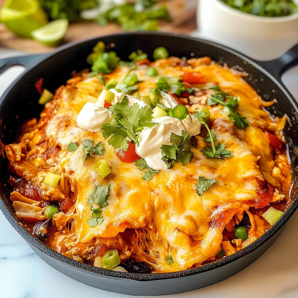 This recipe is perfect for busy weeknights or cozy family gatherings. As you take the first bite, the layers of flavor unfold, offering a delightful combination of spicy and savory notes. The colors are inviting, promising a meal that is as pleasing to the eye as it is to the palate. Whether you’re entertaining friends or just treating yourself to something special, this Scrumptious Chicken Enchilada Skillet will leave everyone asking for seconds.